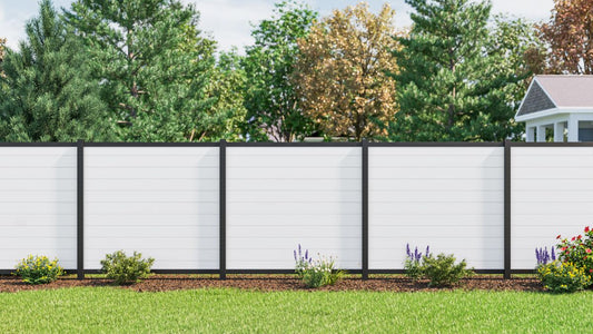 - A modern fusion of matte black aluminum framing with vinyl infill boards